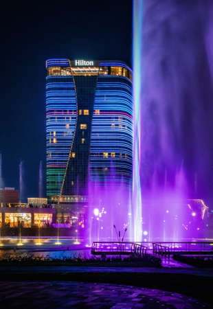 Tashkent, Uzbekistan - 30 October, 2019: beautiful dancing fountain illuminated at night with reflection in pond in new Tashkent City Park