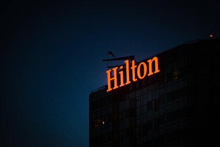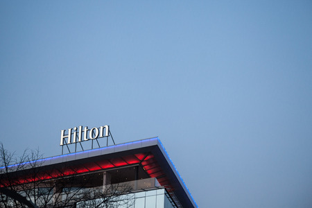BELGRADE, SERBIA - MARCH 25, 2018: Hilton logo reads on their newly opened hotel in Belgrade, during the evening. Hilton is one of the biggest brands of luxury hotels