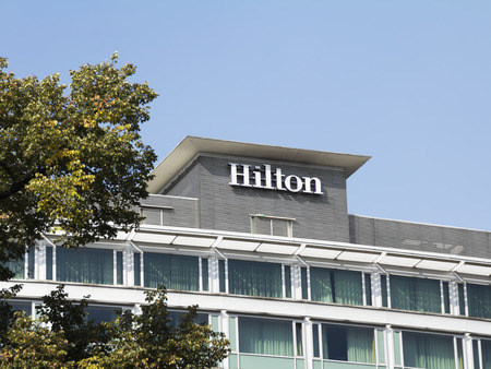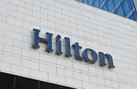 PRAGUE, CZECH REPUBLIC - MARCH 31: Hilton hotels and resorts logo on the building of Hilton Prague hotel on March 31, 2016 in Prague, Czech republic.