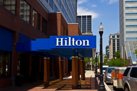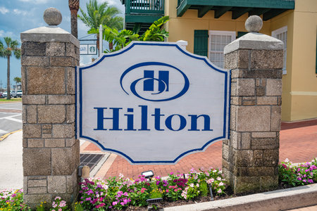 hilton hotel logo. on a stone gate in St. Augustine USA. hospitality company with representative offices in different countries