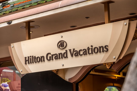 Honolulu, Hawaii - December 26, 2022: Hilton Grand Vacations sign on asian influenced building at the Hilton Hawaiian Village, Waikiki.