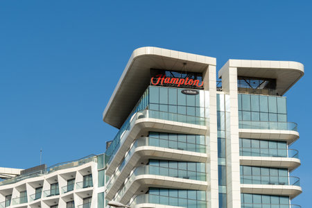 Ras al Khaimah, UAE, 1.27.2022 - Hampton by Hilton Hotel and Resort on Marjan Island on blue sky for tourism and luxury hotel