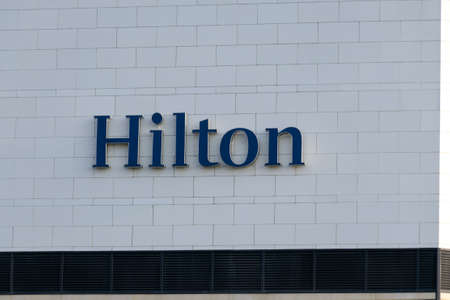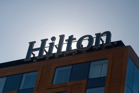 Saint Petersburg, Russia - April 06, 2019: Hilton hotel logo on the roof of the office building