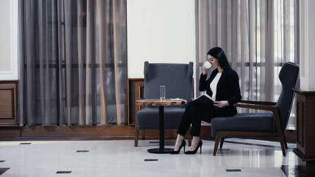 Businesswoman looking at paper folder with documents and drinking coffee in restaurant