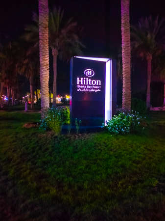 Sharm El Sheikh, Egypt - September 9, 2020: The entrance sign of Hotel Hilton Sharks Bay Resort at Sharm El Sheikh, Egypt on September 9, 2020