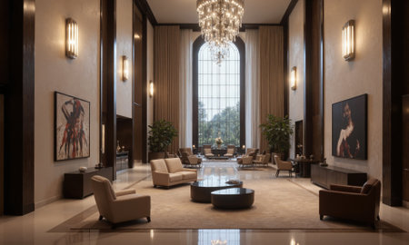 Sophisticated hotel lobby with contemporary artwork, soft leather seating, and crystal chandeliers. Task lighting highlights seating and artwork, while ambient lighting creates