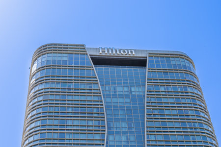 NEW YORK, USA - 17 MAY, 2019: Hilton hotels and resorts logo on the building of Hilton in New York USA