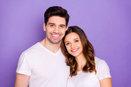 Closeup photo cheerful pretty lady handsome guy couple good mood hugging leaning heads romance date photographing wear casual white t-shirts isolated purple pastel color background