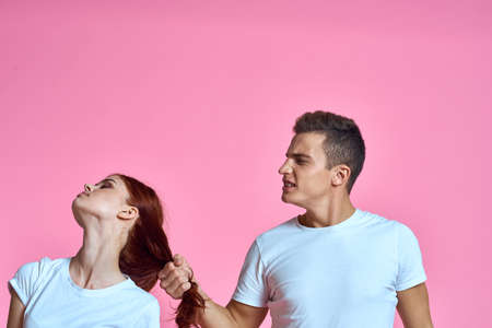 enamored man and woman hugging each other on a pink background cropped with Copy Space family portrait