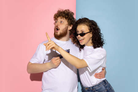 Half length portrait of young excited man and girl in white t-shirts isolated on blue and pink trendy color background. Human emotions concept