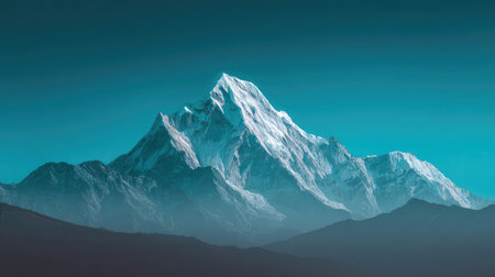 Experience the breathtaking beauty of a majestic snow-capped mountain peak blanketed in fog under a serene blue sky, showcasing nature's grandeur and tranquility.
