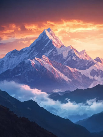This breathtaking image captures the grandeur of a majestic mountain range its peaks piercing the clouds under a sky ablaze with the rich hues of a stunning sunset The dramatic lighting casts a warm