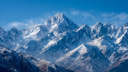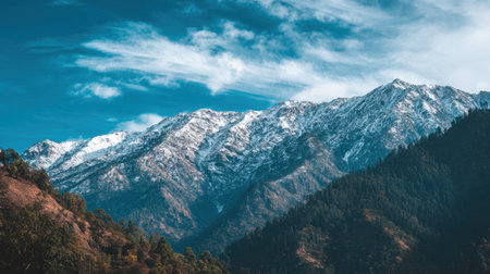 Majestic snow capped mountains rise against vibrant blue sky, surrounded by lush green forests and rocky terrain, creating breathtaking natural landscape