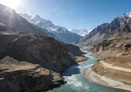 View of confluence of the Indus and Zanskar rivers located in Leh, Ladakh, Jammu and Kashmir, India.