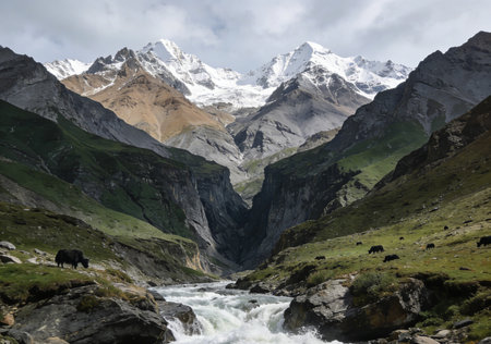 Discover a breathtaking landscape showcasing a majestic snow-capped mountain peak beneath a dramatic sky. The serene valley below invites exploration and adventure.