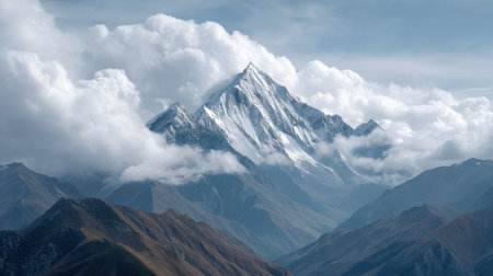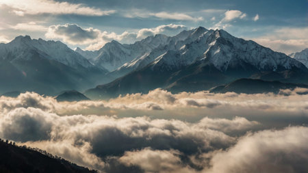 majestic mountain range shrouded in misty clouds, with snow-capped peaks visible, created with generative ai