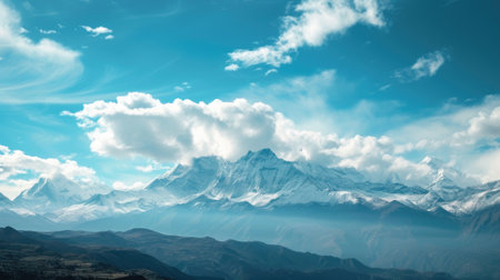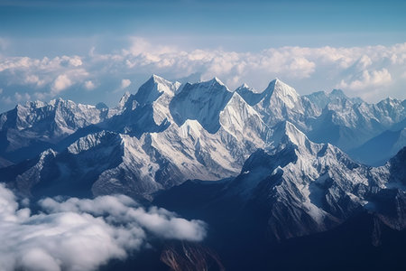 Aerial view of Himalaya mountain range with clouds and blue sky