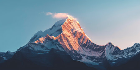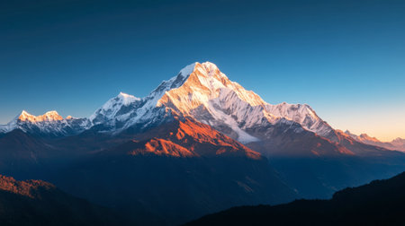 This image captures a breathtaking view of a mountain range during sunset. The peaks are bathed in a warm, golden light, creating a stunning contrast against the deep blue sky. The snow-capped mountains dominate the scene, with their rugged slopes and sharp ridges adding to the dramatic effect. The foreground features a darker, shadowed area, highlighting the depth and scale of the landscape. The serene and majestic atmosphere is perfect for nature enthusiasts and adventurers alike.