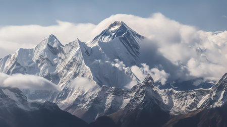 majestic Himalayan peaks shrouded in clouds, panoramic shot, high-altitude drama, clouds hugging the snowy peaks, stark whites and icy blues, raw and powerful nature