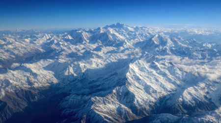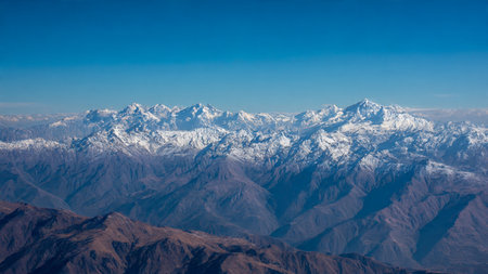 Aerial view of Himalaya mountain range with snow and clear blue sky