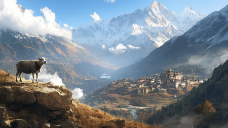 A breathtaking mountain landscape featuring a sheep in the foreground, with a stunning ancient village nestled amidst snow-capped peaks and valleys.