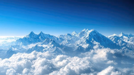 A breathtaking view of the snow-capped peaks of the Himalayas under a clear blue sky, with rolling clouds below.
