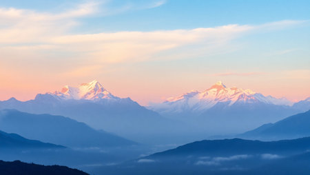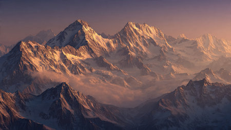 A stunning view of snow-covered mountains enveloped in a gentle mist, creating a serene atmosphere. Ideal for nature lovers and adventure enthusiasts seeking inspiration.