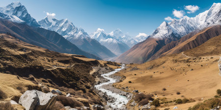 Panoramic view of Himalaya mountain range and river. Everest region, Nepal