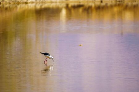 Foraging black-winged stilt, common stilt, or pied stilt (Himantopus himantopus), a very long legged wader bird, in shallow water