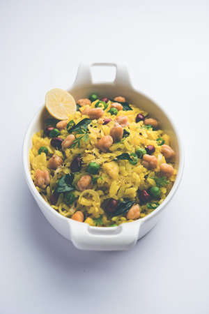 Power Kabuli Chana Poha or Protein Rich Choley Pohe, Popular Maharashtrian, Indian breakfast recipe, selective focus