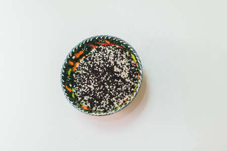 Black cumin in an oriental plate with patterns. White sesame and black cumin in the plate. Chernushka sowing in the plate. Oriental spices for cooking.