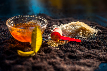 Mustard seed face mask for wrinkles and dark spots. Shot of face mask ingredients which are mustard seeds powder, honey, gram flour, and some rice flour.