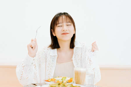 A girl eating happily in a cafe.