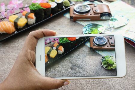Travel accessories of smart phone map camera and sushi japanese