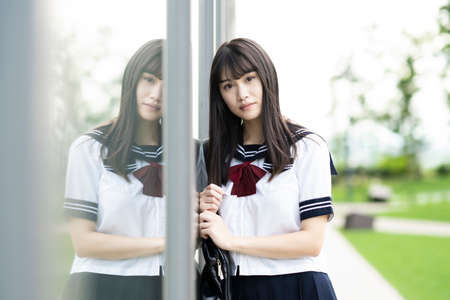 A young woman stands outside, dressed in a school uniform, with a thoughtful expression on her face. She gazes towards the horizon, enjoying the beautiful sunny weather and clear blue sky.