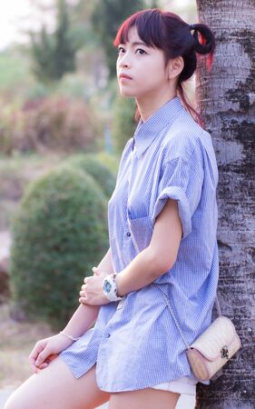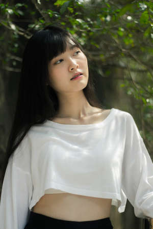 Portrait of thai adult beautiful girl white shirt black skirt relax time
