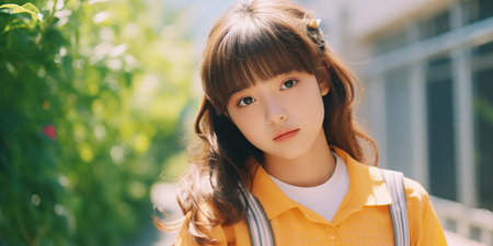 A young girl with long, dark hair and serious expression stands outdoors. A resident of Kazakhstan, a beautiful girl of 15 years old. Schoolgirl, student or applicant. Modern generation. AI generated.
