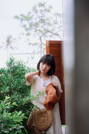 Fashion portrait - Beautiful asian thai woman traveler at country side hotel. Local business.