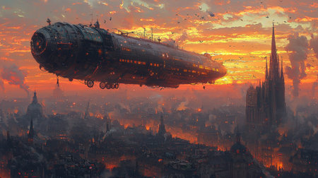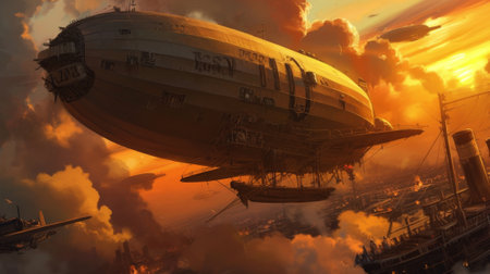 Soaring high tranquil ocean futuristic airship captures essence innovation backdrop golden sunlight and dynamic clouds.