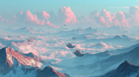 A stunning landscape showcasing towering snowy mountains under a sky filled with fluffy clouds. Floating ships create a magical and serene atmosphere during sunrise.