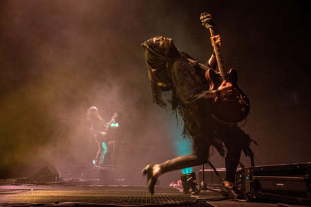 Krakow, Poland - September 20, 2014: An artist in disguise playing guitar in a hardcore western rock band music concert performance.