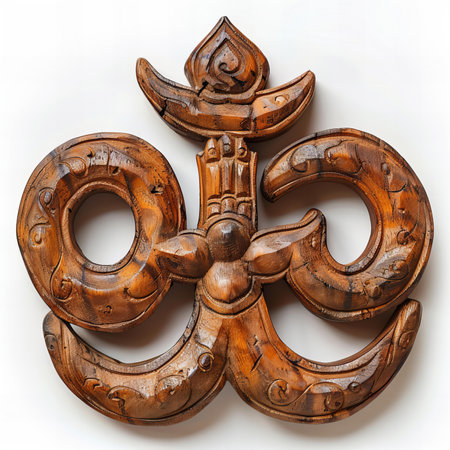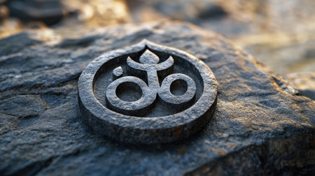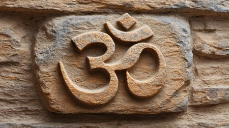A beautifully carved Om symbol on a rustic stone wall highlights its spiritual essence and cultural significance, making it ideal for themes of meditation and wellness.