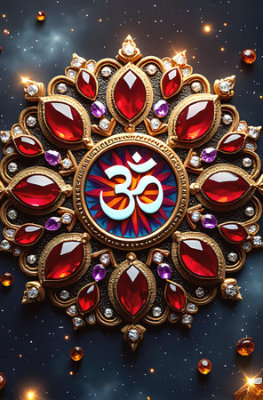 This vibrant mandala features the Om symbol at its center, surrounded by stunning red and purple gemstones, creating an elegant and spiritual atmosphere.
