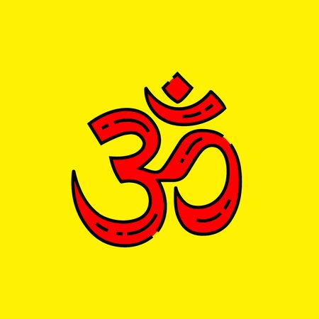 Hinduism symbol. Indian om calligraphy line icon. Red Hindu religion sign isolated on yellow background. Vector illustration.