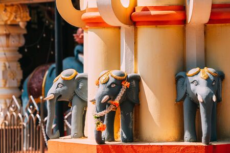 Mapusa, Goa, India. Elephant Statue Near The Shree Ganesh Mandir, Ganeshpuri Temple. Famous Landmark And Popular Destination