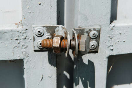 Old rusty bolt with screw nut used like a lock on the metal gate. homemade lock.