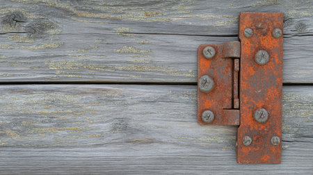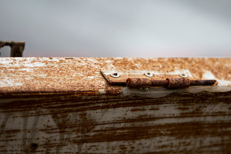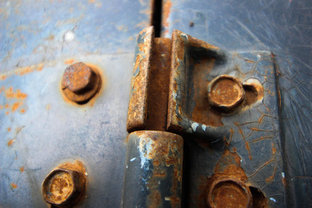Rusty hinge on a wooden door