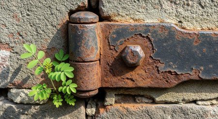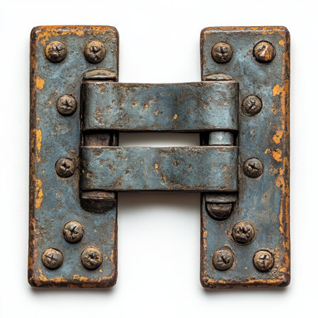 A close-up of a vintage iron hinge showcasing a rich, rusted texture and weathered patina. the aged metalwork highlights intricate craftsmanship, ideal for historical or industrial design inspiration.