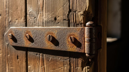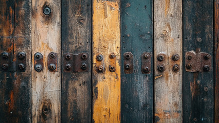 Close-up of a rustic wooden door featuring intricate metal hardware. The weathered texture showcases the charm of aged wood and craftsmanship. Perfect for architectural themes.