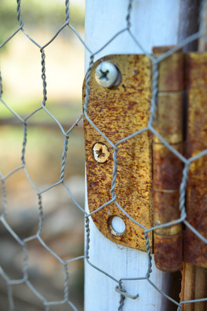 Close-up of a rusty hinge on a fence. Selective focus.